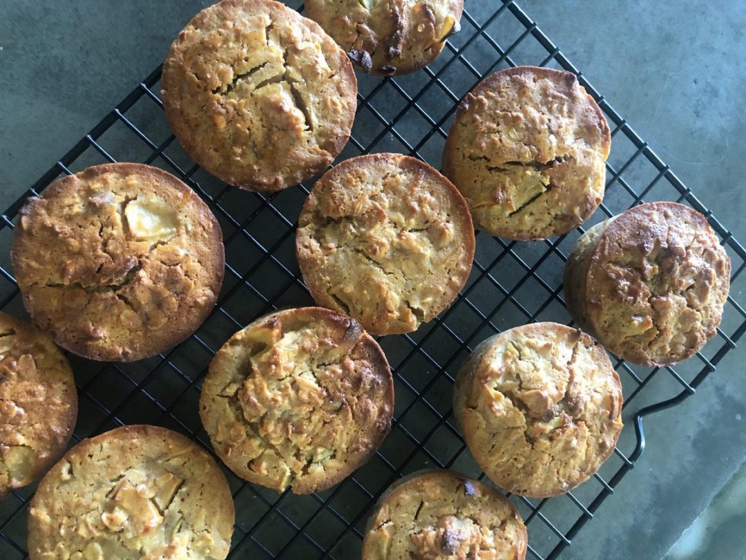- Combine in a large bowl: oats, cubed apple, grated apple, grated carrot, RMS, yoghurt, oil and eggs.