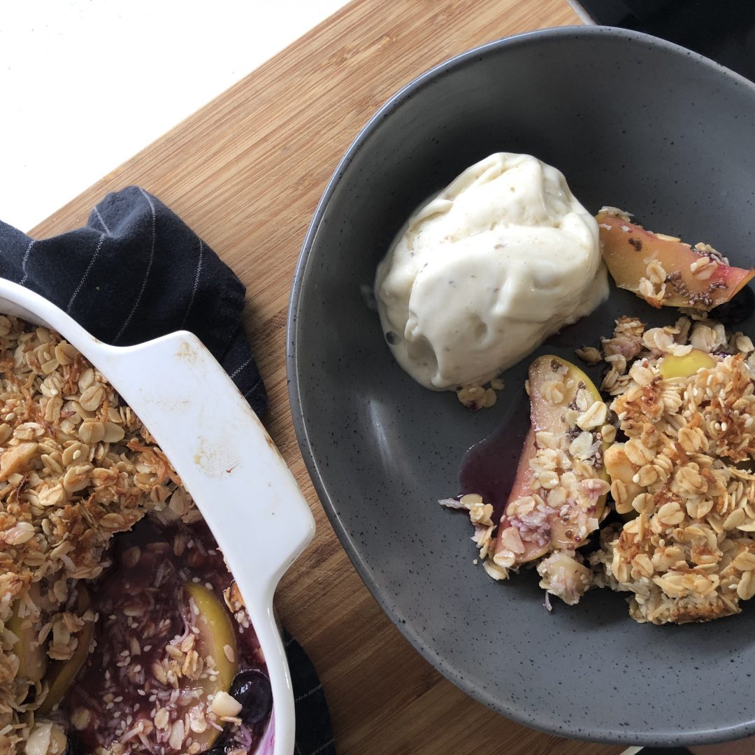 - This crumble is delicious served with a scoop of 'nice cream' and another sprinkle of cinnamon.