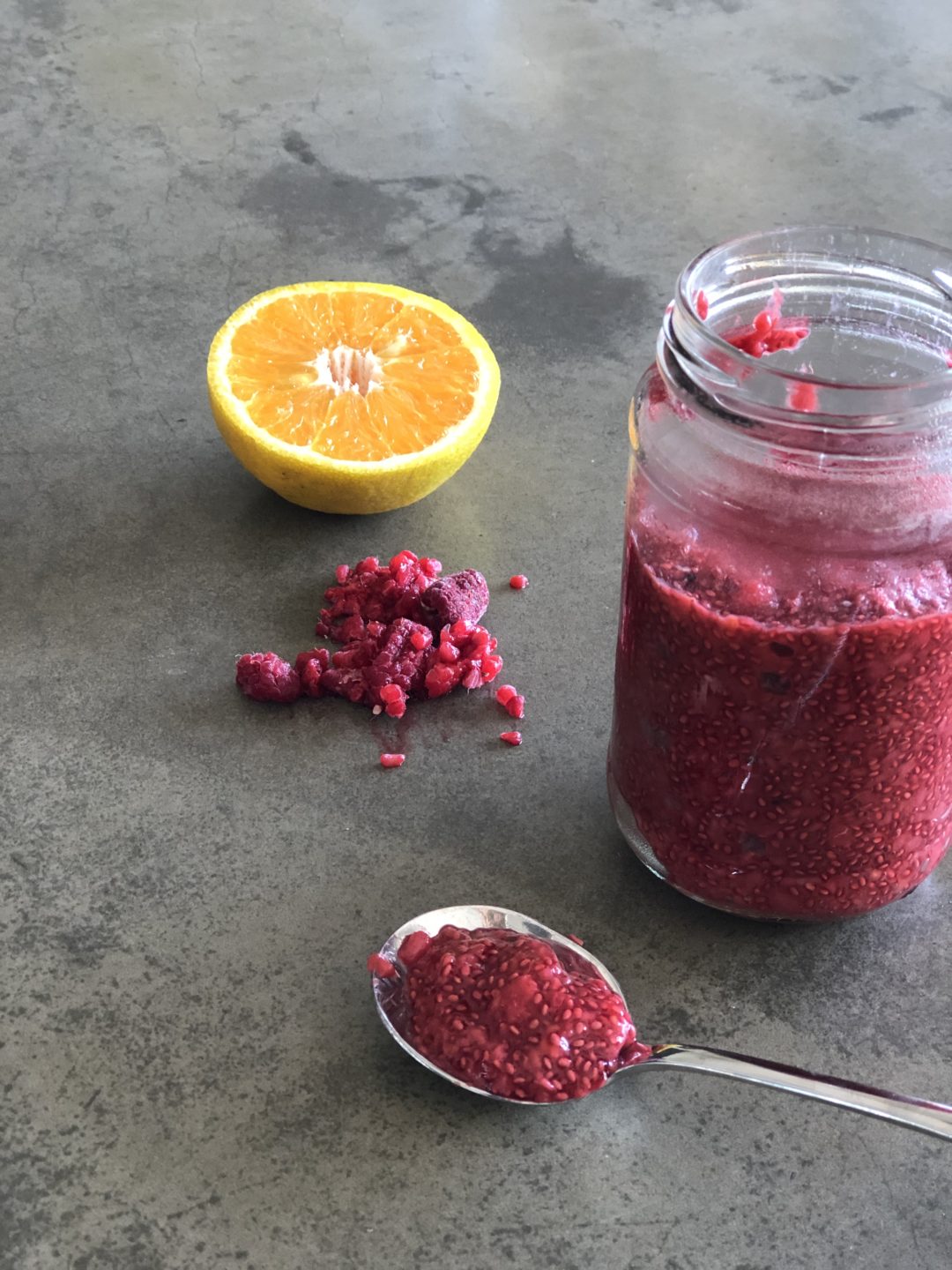 Quick, delish and super easy, 3 ingredient, raspberry chia jam. Why bother making your own?? 🤔 Did you know that some ‘store-bought’ jam contains more sugar than it does fruit! 😳 But not this version. Fresh orange juice is the natural sweetener here (we used juice of two oranges) and there is no added sugar.
